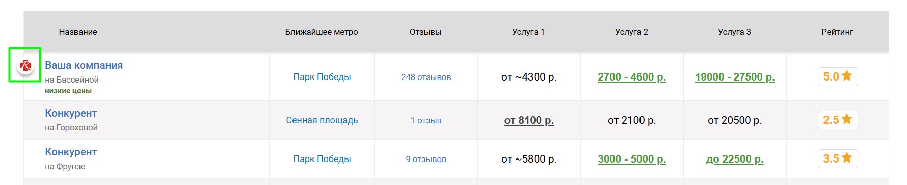 компаний, продвигаемая компания попадёт к ним в таблицу «Сравнение по ценам», которая выглядит следующим образом: